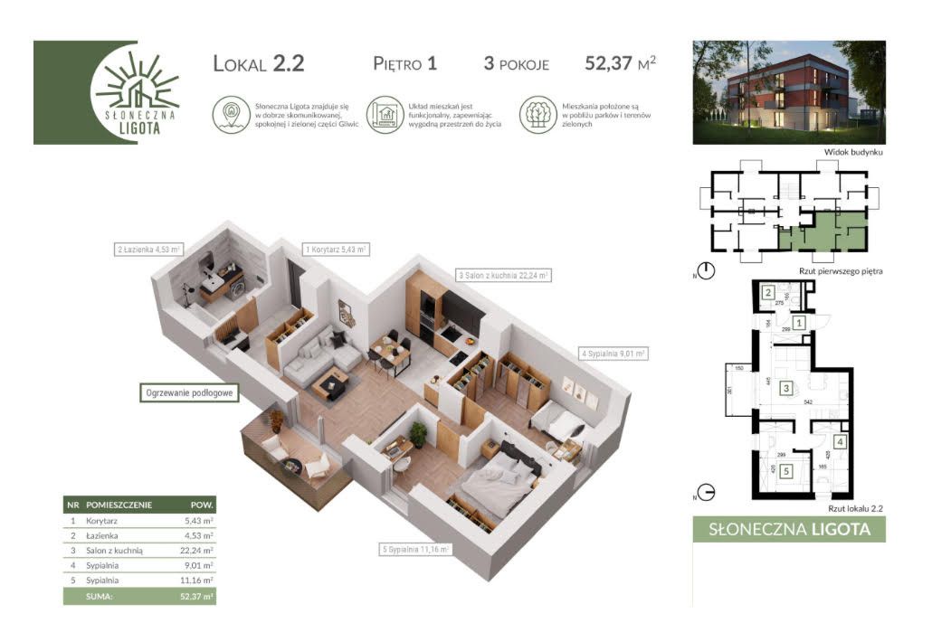 Prezentowane mieszkanie o pow. 52,37m2 składa się z:Korytarza 5,43m2